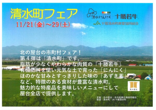 2025.11.12 清水町フェアのお知らせ 市町村別フェア第4弾!清水町フェアを行います。 期間は 11月21日(金)~29日(土)までの9日間 清水町のおいしい食材、十勝若牛・にんにく・あずき茶をメインに、屋台各店で特別メニューをご提供します! 今年も残すところ50日を切りました。 残りの期間を元気に乗り切るために北の屋台でエネルギーチャージしましょう!! 11月21日は午後6時から屋台中央広場で「あずき茶の試飲会」も行います。 ぜひ、お楽しみに!!